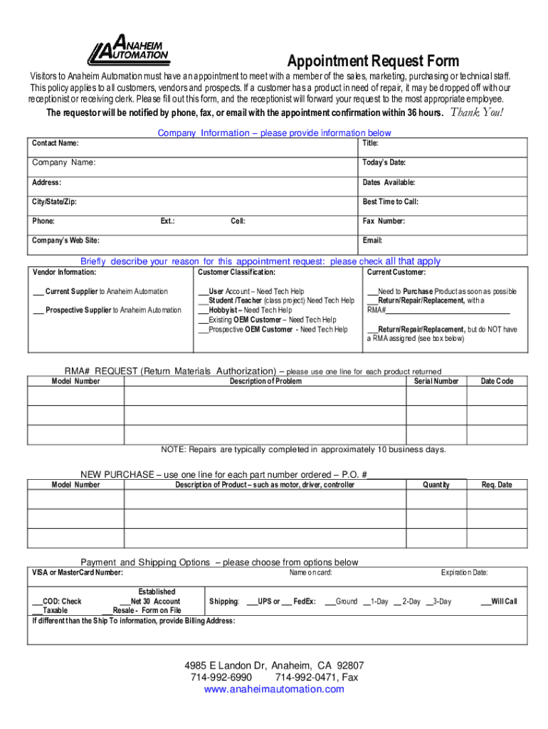 Fill out the Appointment Request Form to schedule a meeting with Anaheim Automation staff. Get a confirmation within 36 hours.