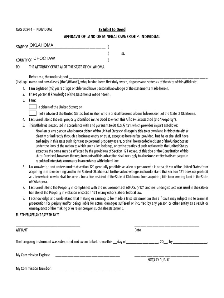 An affidavit for individuals to assert ownership of land or mineral rights in Oklahoma, compliant with state laws regarding aliens and land ownership.