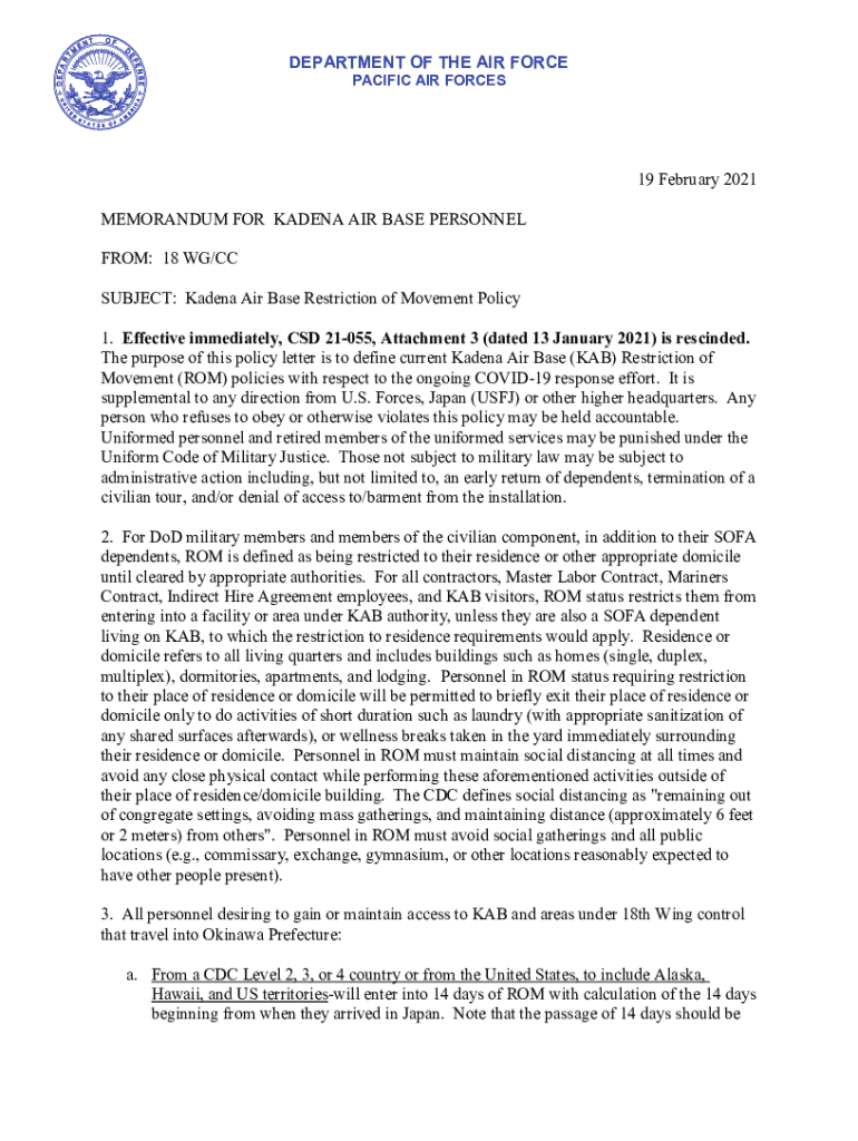 DEPARTMENT OF THE AIR FORCE PACIFIC AIR FORCES19 February 2021 MEMORANDUM FOR KADENA AIR BASE PERSONNEL FROM: 18 WG/CC SUBJECT: Kadena Air Base Restriction of Movement Policy 1. Effective immediately,