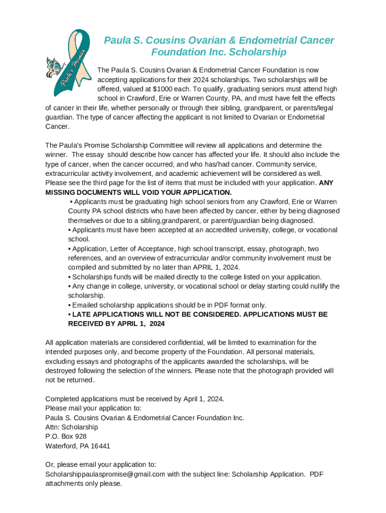 Paula S. Cousins Ovarian & Endometrial Cancer Foundation Inc. Scholarship Application word template: frequently asked questions