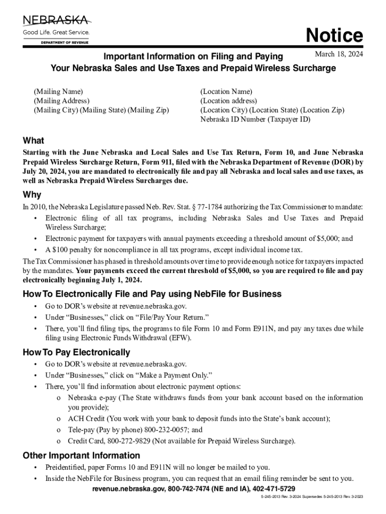 Notice March 18, 2024 Important Information on Filing and Paying Your Nebraska Sales and Use Taxes and Prepaid Wireless Surcharge(Mailing Name) (Mailing Address) (Mailing City) (Mailing State) (Mailing