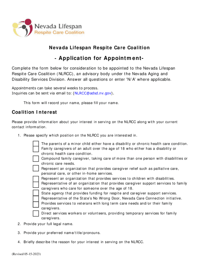 Complete the application to join the Nevada Lifespan Respite Care Coalition, supporting caregivers for individuals with disabilities. Inquiries: NLRCC@adsd.nv.gov.