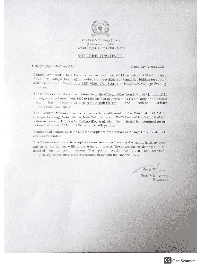 CamScannerP.G.D.A.V. College (Evening) (University of Delhi)Nehru Nagar, New Delhi110065Special Term and Condition for the work of Supply, Installation, Testing and Commissioning of Indoor LED Video