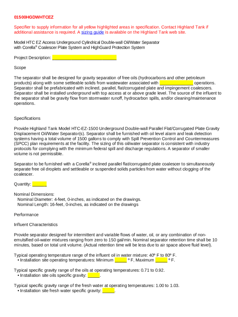 Instructions for the form Provide Highland Tank Model HTC-EZ-1500 Underground Double-wall Parallel Flat/Corrugated Plate Gravity Displacement Oil/Water Separator(s)