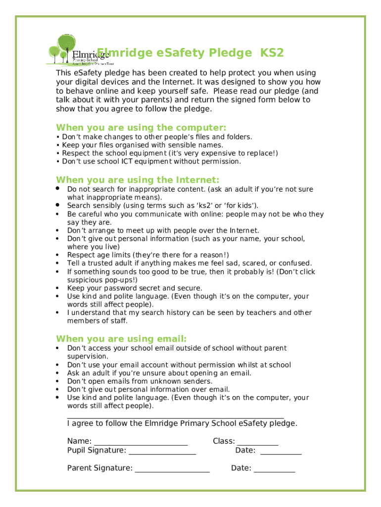 Instructions for the Elmridge Esafety Pledge Ks2 form