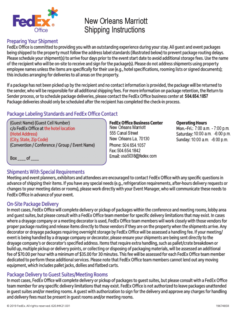 New Orleans Marriott504.654.1057New Orleans Marriott 555 Canal Street New Orleans La, 70130 504.654.1057 504.654.1842 usa5038@fedex.com7:00 a.m. 7:00 p.m. 10:00 a.m. 6:00 p.m. 10:00 a.m. 6:00 p.m.New