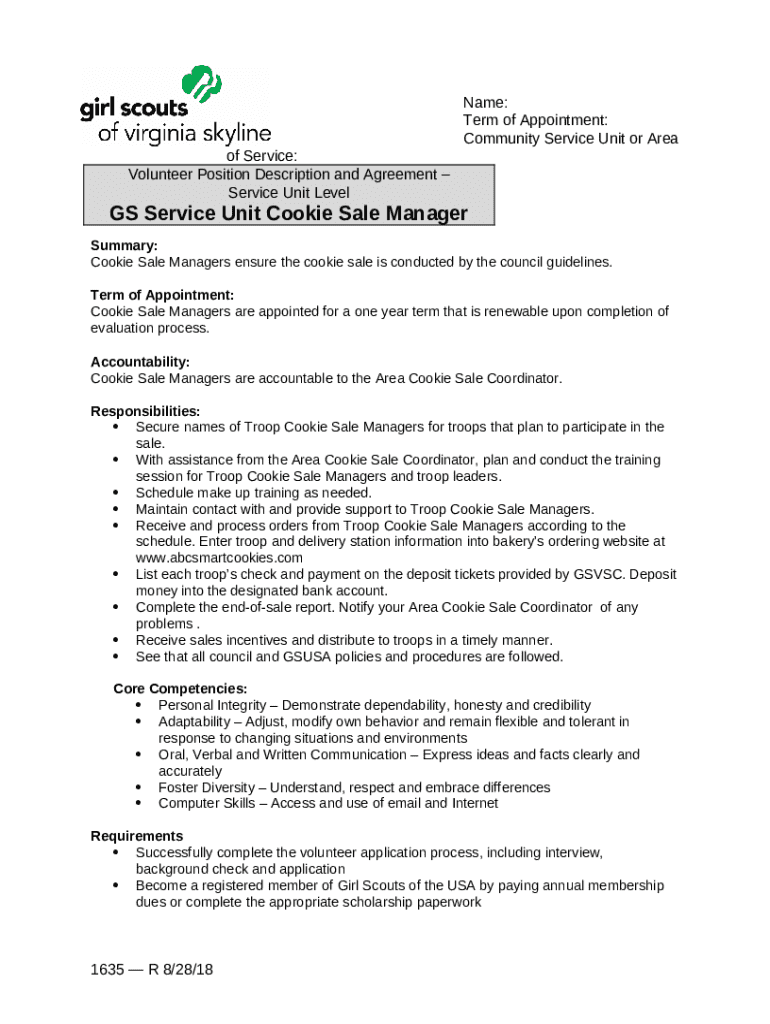Instructions for the form Service Unit Cookie Manager Accountable to