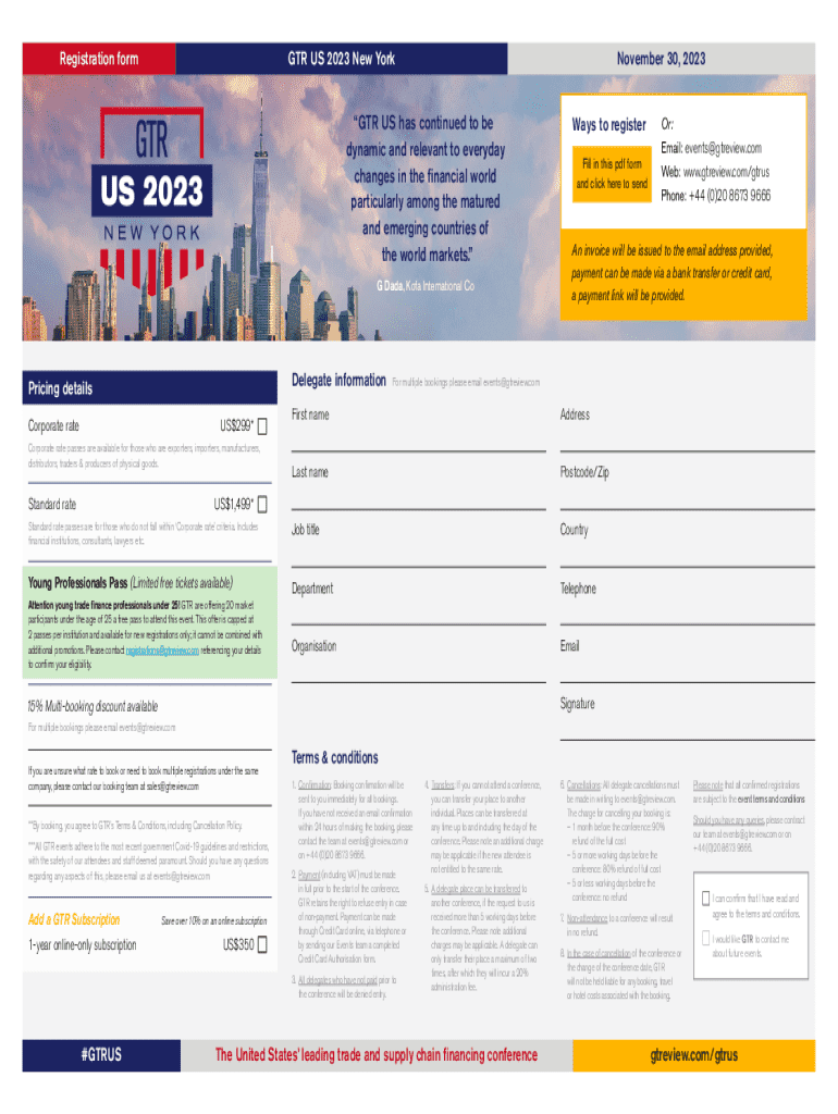 Join us on November 30, 2023, at the GTR US conference in New York for insights on trade, supply chain financing, and networking opportunities with leading experts.
