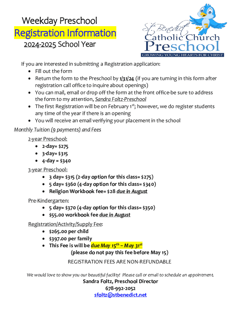 Weekday PreschoolRegistration Information 20242025 School Year If you are interested in submitting a Registration application: Fill out the form Return the form to the Preschool by 1/31/24 (if you