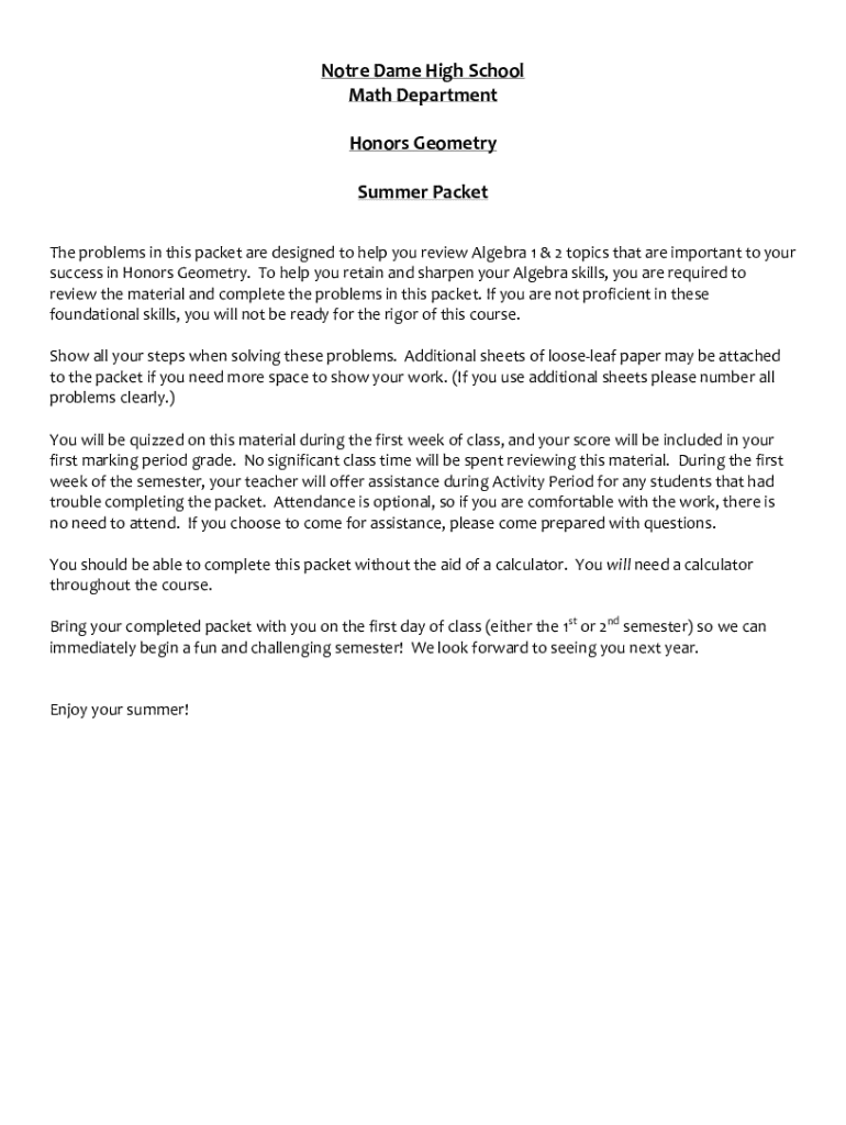 Get the free Honors Geometry Summer Packet