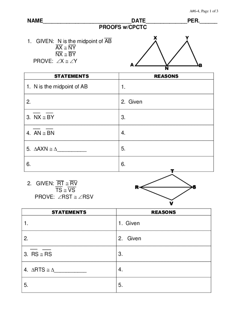 A#64, Page 1 of 3NAME___DATE___PER.___ PROOFS w/CPCTC X1. GIVEN: N is the midpoint of AB AX NY NX BY PROVE: X YAYBNSTATEMENTSREASONS1. N is the midpoint of AB1.2.2. Given3. NX BY3.4. AN BN4.5. AXN