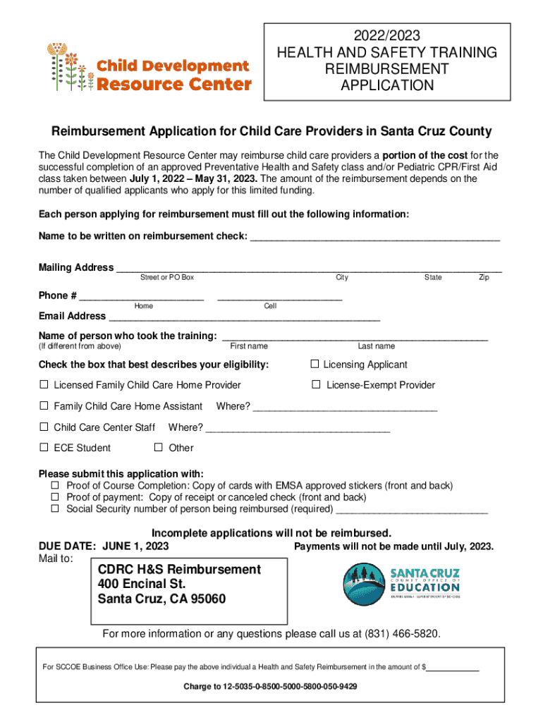Apply for reimbursement for preventative health and safety training courses taken between July 2022 and May 2023 in Santa Cruz County. Submit by June 1, 2023.