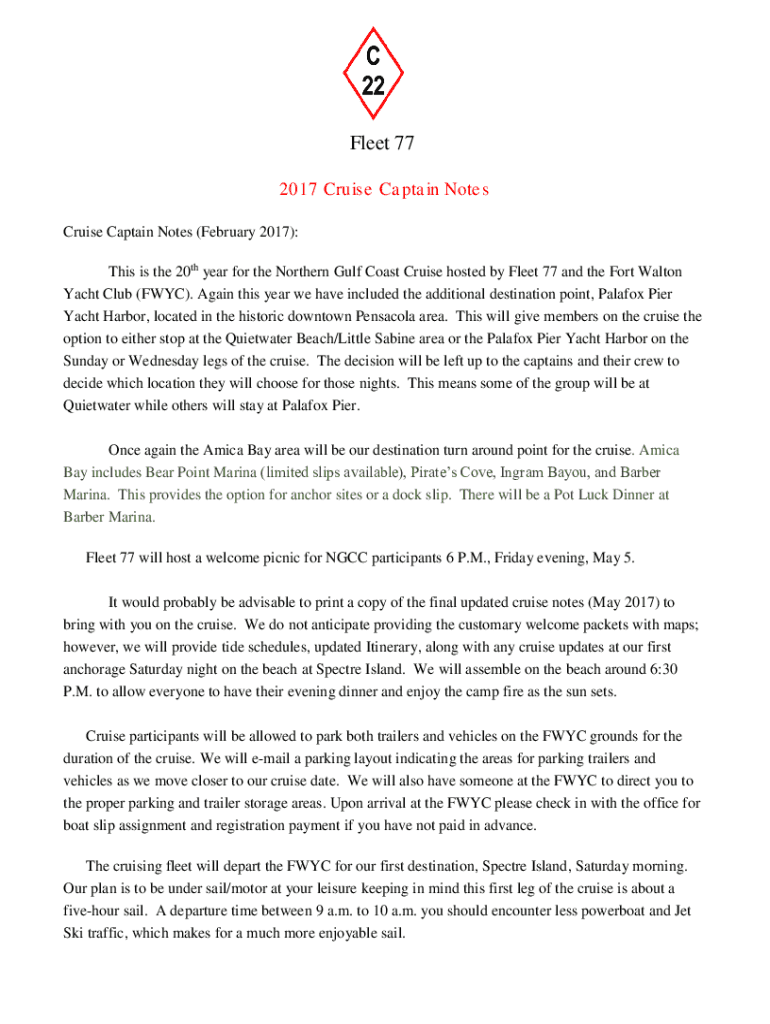 Fleet 77 2017 Cruise Captain Notes Cruise Captain Notes (February 2017): This is the 20th year for the Northern Gulf Coast Cruise hosted by Fleet 77 and the Fort Walton Yacht Club (FWYC). Again this