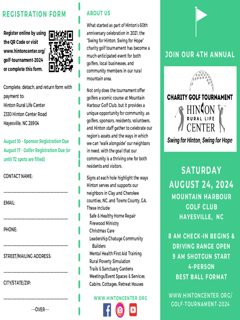 REGISTRATION FORM Register online by using the QR Code or visit www.hintoncenter.org/ golftournament2024 or complete this form. Complete, detach, and return form with payment to: Hinton Rural Life