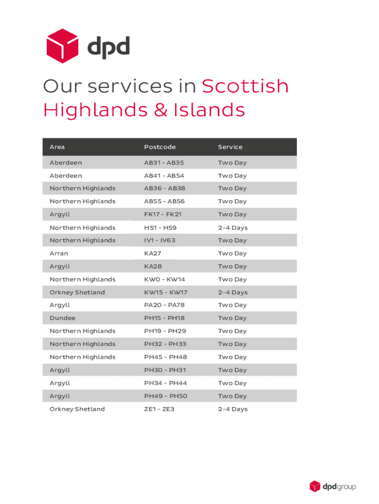 Our services in Scottish Highlands & Islands AreaPostcodeServiceAberdeenAB31 AB35Two DayAberdeenAB41 AB54Two Northern HighlandsAB36 AB38Two Northern HighlandsAB55 AB56Two DayArgyllFK17 FK21Two Northern