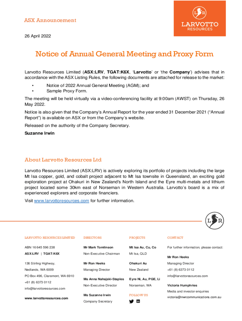 Get the free Notice of Annual General Meeting and Proxy Form