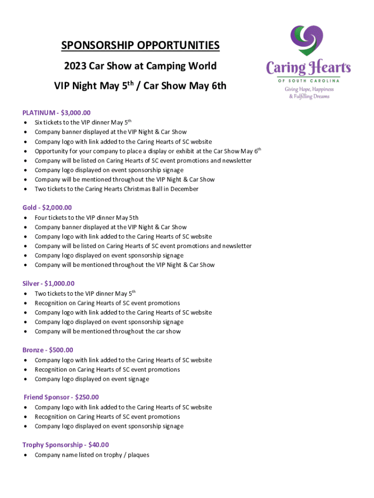 Explore various sponsorship levels for the 2023 Car Show at Camping World, featuring VIP Night on May 5th. Support Caring Hearts of SC and gain visibility.