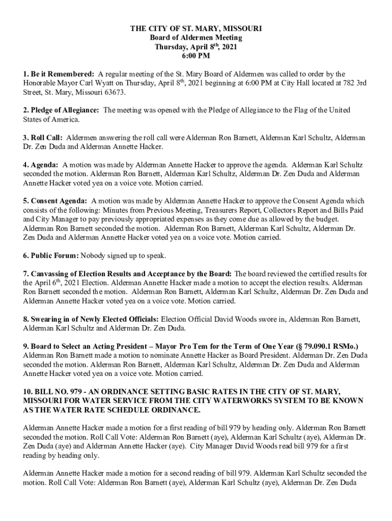 THE CITY OF ST. MARY, MISSOURI Board of Aldermen Meeting Thursday, April 8th, 2021 6:00 PM 1. Be it Remembered: A regular meeting of the St. Mary Board of Aldermen was called to order by the Honorable