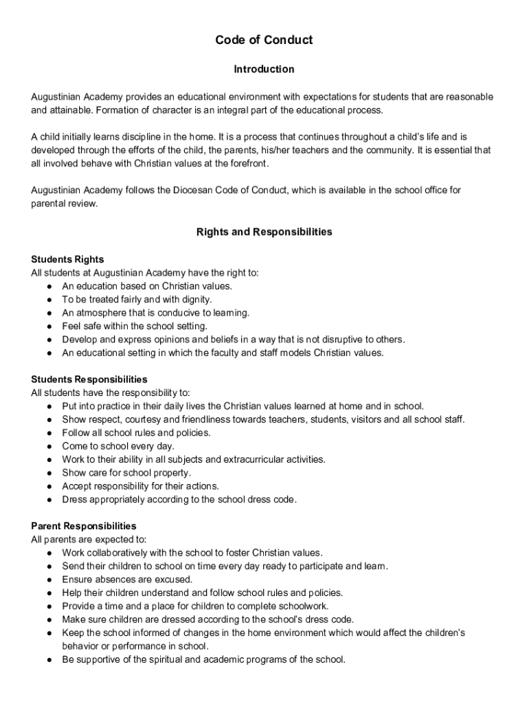 Explore the Augustinian Academy\'s Code of Conduct, highlighting student rights, responsibilities, and guidelines for behavior, ensuring a respectful and Christian educational environment.