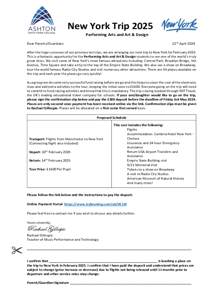 New York Trip 2025 Performing Arts and Art & Design22nd April 2024Dear Parents/GuardiansAfter the huge successes of our previous ten trips, we are arranging our next trip to New York for February