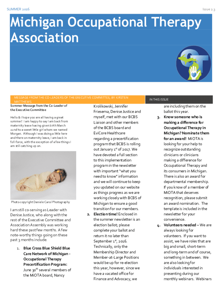 SUMMER 2016Issue 2.3244Michigan Occupational Therapy AssociationMESSAGE FROM THE COLEADERS OF THE EXECUTIVE COMMITTEE, BY KIRSTEN MATTHEWS Summer Message from the CoLeader of Kalinowski, Jennifer