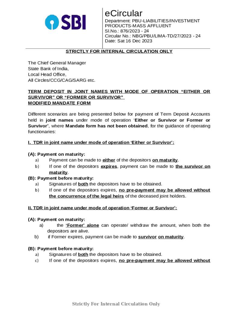 This circular outlines procedures for premature withdrawal of term deposits in joint names with revised mandate forms for either or survivor mode, enhancing operational guidance.