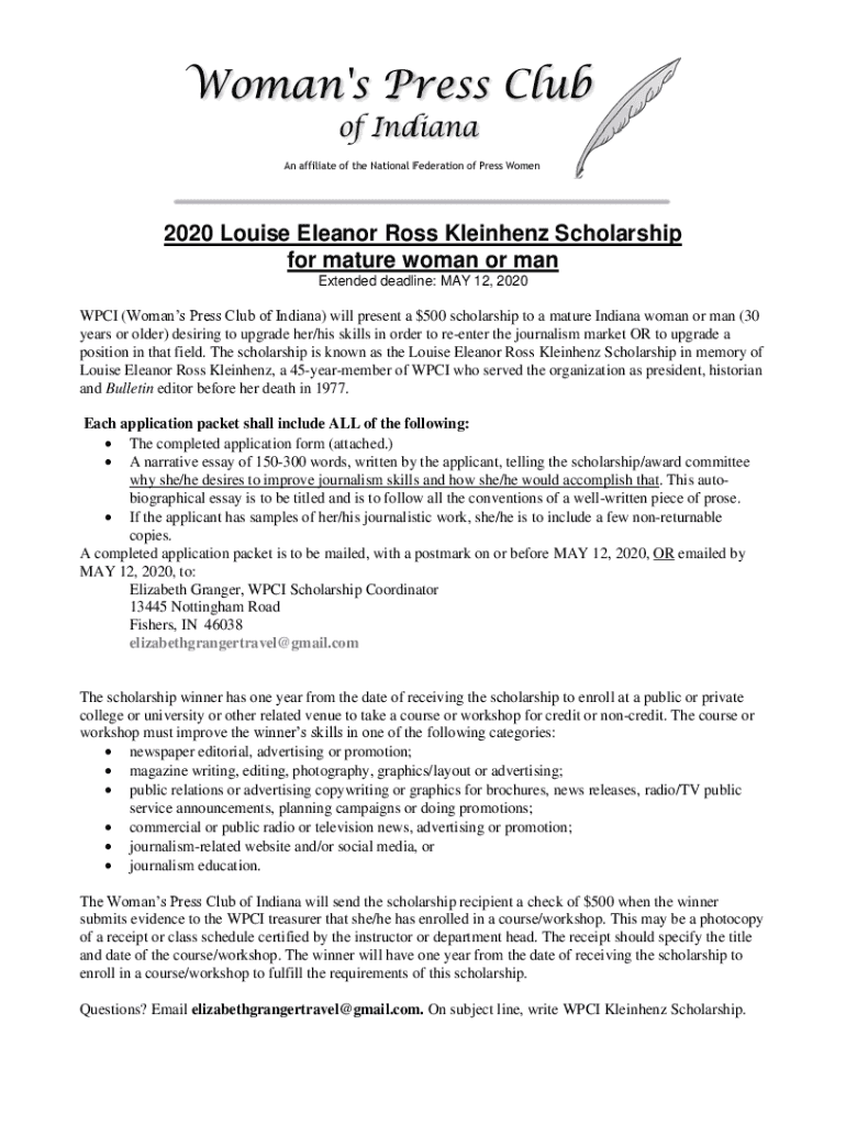 Apply for the 2020 Kleinhenz Scholarship, offering $500 for mature individuals enhancing journalism skills. Extended deadline: May 12, 2020.