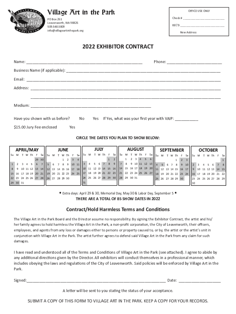 Participate in the 2022 Village Art in the Park with this exhibitor contract. Secure your spot and showcase your art in Leavenworth, WA.