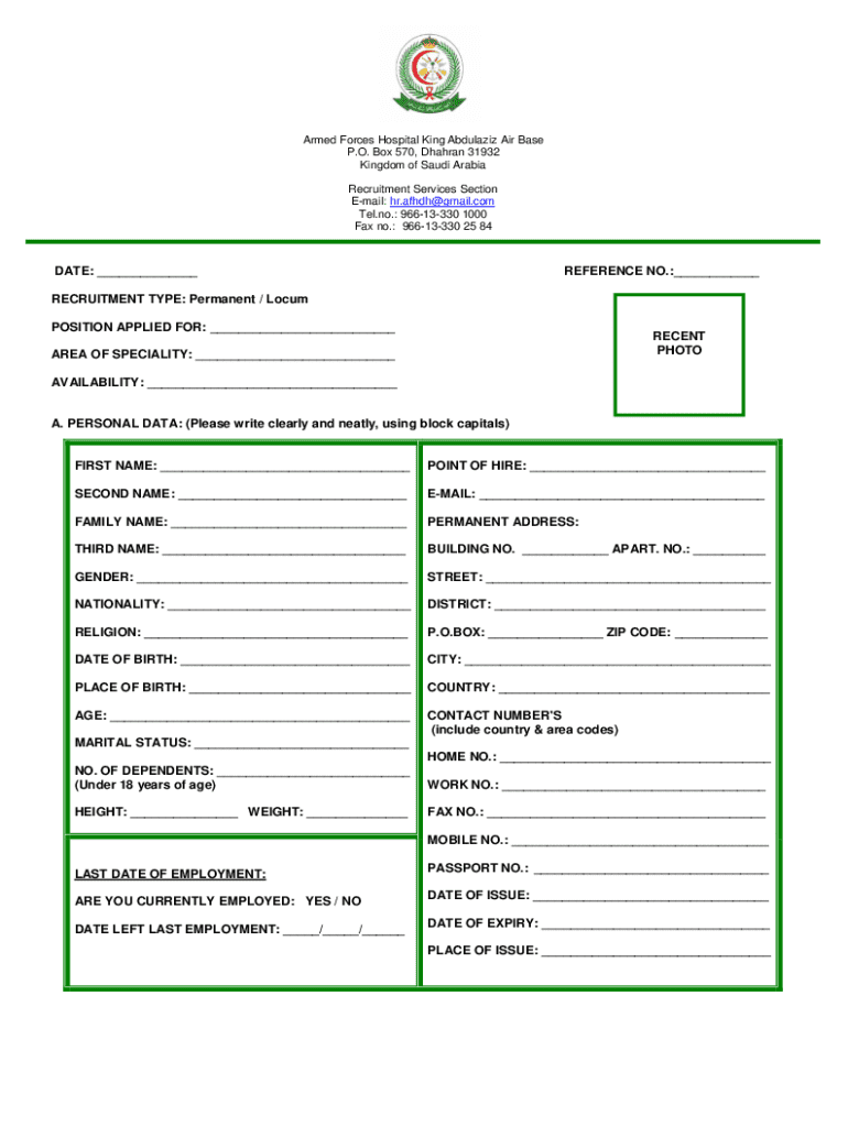 Complete this Employment Application Form for Armed Forces Hospital. Include personal data, education, employment history, references, and medical history.