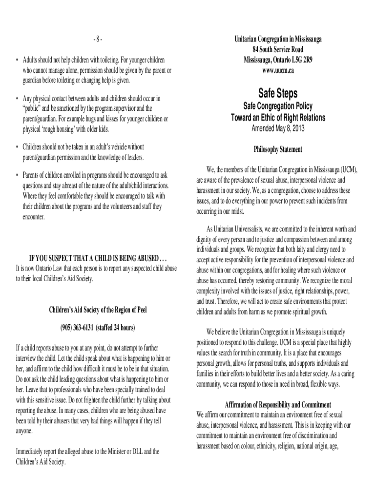 This document outlines the Safe Steps Policy aimed at preventing abuse and ensuring child and adult protection within the Unitarian Congregation in Mississauga.