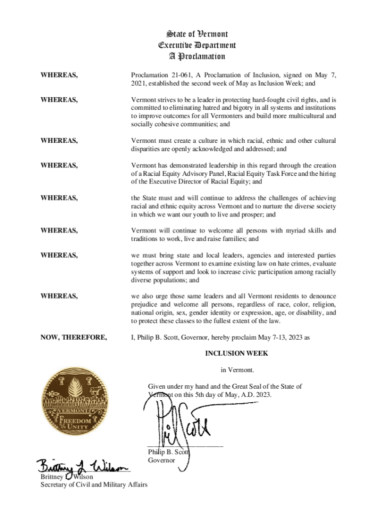 This proclamation establishes May 7-13, 2023, as Inclusion Week in Vermont, promoting equity and diversity across the state.