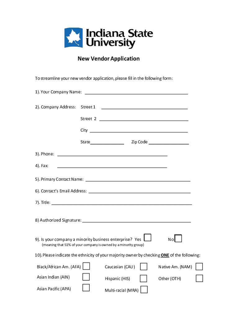 Fill out the New Vendor Application to register your business, including details on ownership status, certifications, and necessary paperwork for Indiana State University.
