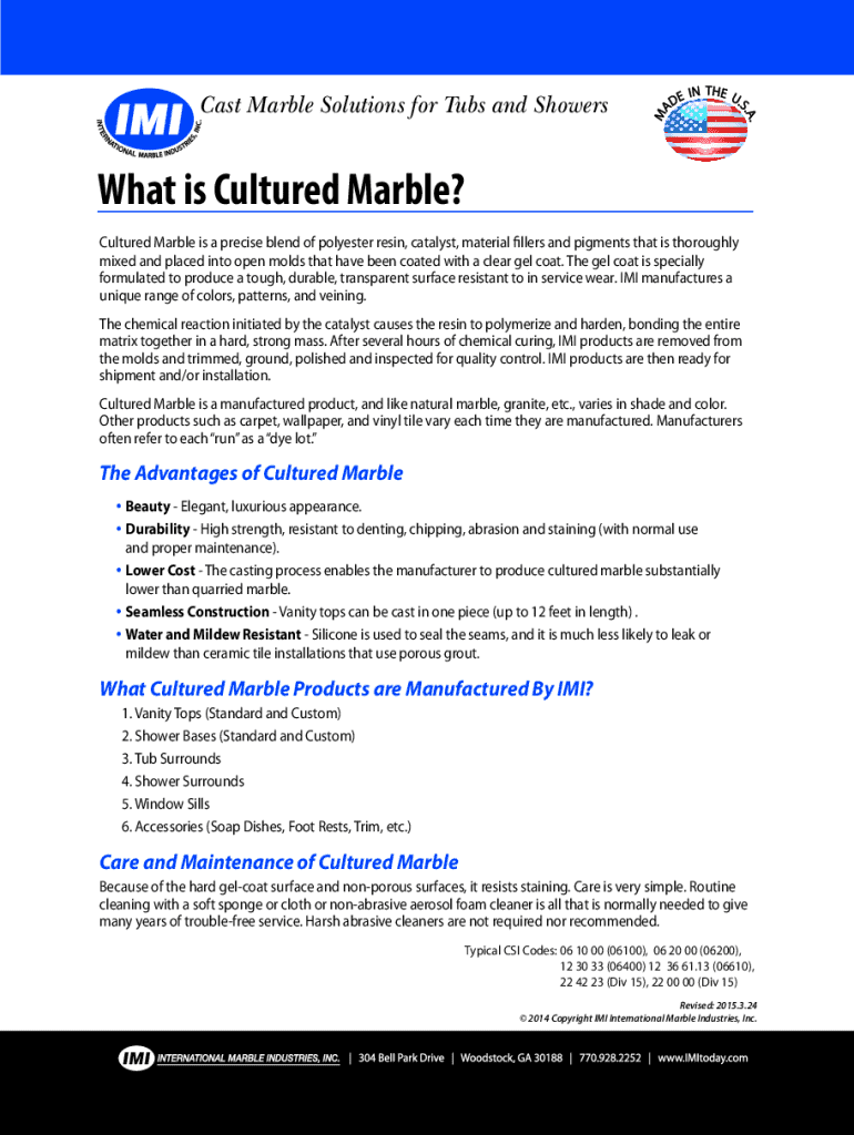 Cast Marble Solutions for Tubs and Showers!1::::.what is Cultured Marble? Cultured Marble is a precise blend of polyester resin, catalyst, material fliers and pigments that is thoroughly mixed and