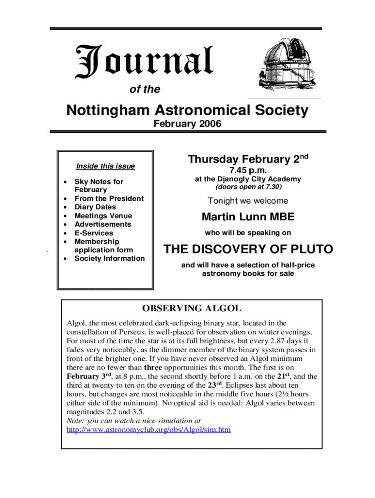 Journal of theNottingham Astronomical Society February 2006Thursday February 2ndInside this issue . 7.45 p.m.Sky Notes for February From the President Diary Dates Meetings Venue Advertisements EServices