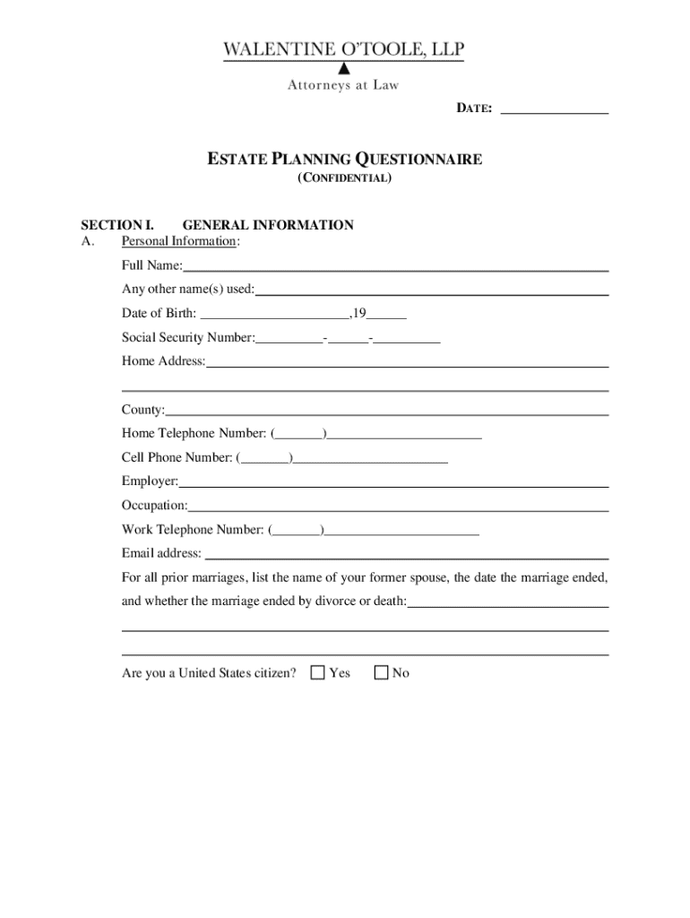 Complete this confidential estate planning questionnaire to ensure your wishes are honored regarding asset distribution, personal representatives, and healthcare decisions.