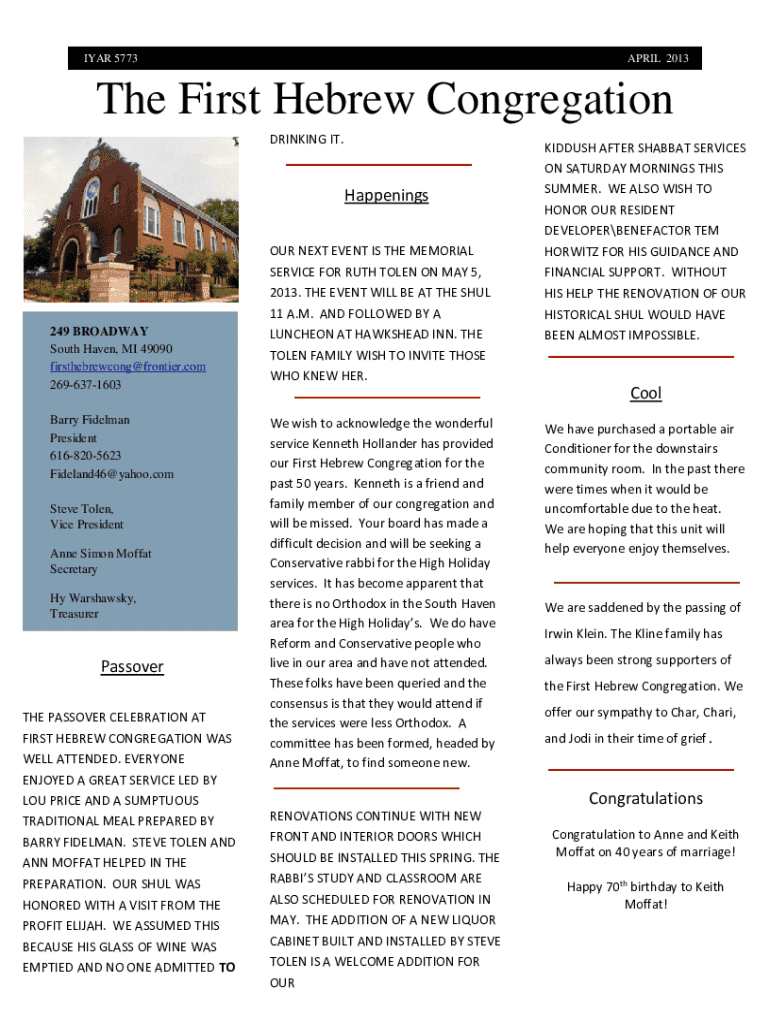 IYAR 5773APRIL 2013The First Hebrew Congregation DRINKING IT.Happenings249 BROADWAY South Haven, MI 49090 firsthebrewcong@frontier.com 2696371603 Barry Fidelman President 6168205623 Fideland46@yahoo.com