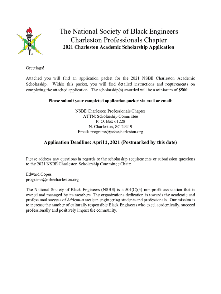 The National Society of Black Engineers Charleston Professionals Chapter 2021 Charleston Academic Scholarship ApplicationGreetings! Attached you will find an application packet for the 2021 NSB Charleston