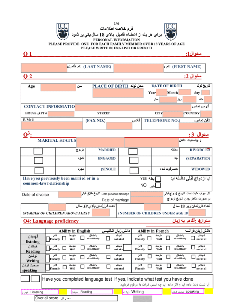 1/6 18 PERSONAL INFORMATION PLEASE PROVIDE ONE FOR EACH FAMILY MEMBER OVER 18 YEARS OF AGE PLEASE WRITE IN ENGLISH OR FRENCHQ1:1 . :( LAST NAME). : ( FIRST NAME)Q2:2 :AgePLACE OF BIRTH DATE OF BIRTH