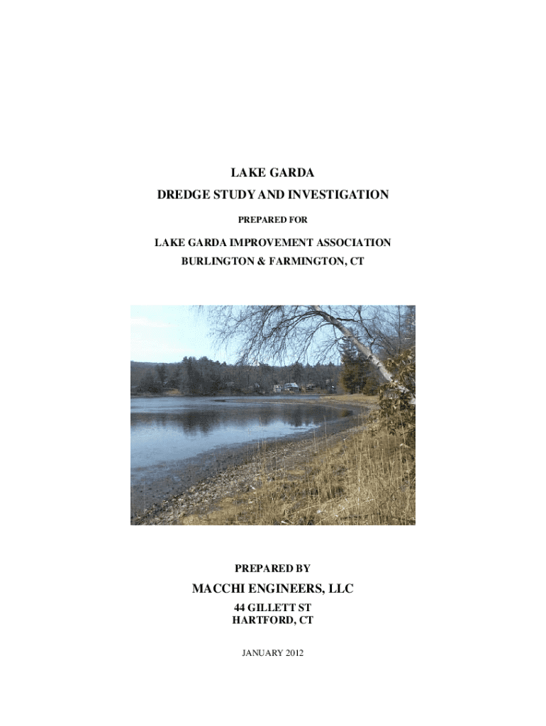LAKE GARDA DREDGE STUDY AND INVESTIGATION PREPARED FORLAKE GARDA IMPROVEMENT ASSOCIATION BURLINGTON & FARMINGTON, CTPREPARED BYMACCHI ENGINEERS, LLC 44 GILLETT ST HARTFORD, CT JANUARY 2012MACCHI ENGINEERS