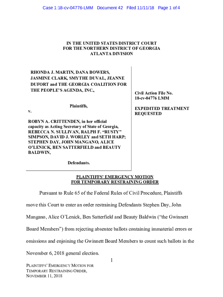 This document outlines the plaintiffs\' request for an emergency motion to ensure absentee ballots with immaterial errors are counted in the November 2018 elections, citing federal law.