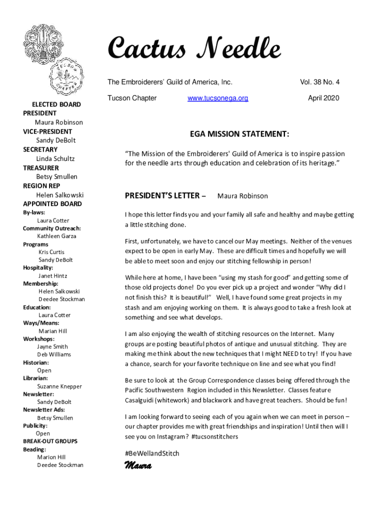 Explore the April 2020 edition of Cactus Needle, featuring updates, workshops, outreach activities, and a mission statement from the Tucson Chapter of the Embroiderers\' Guild of America.