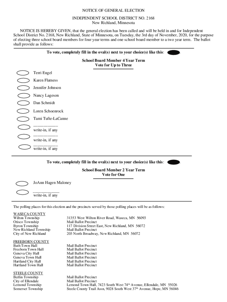 Discover the details of the November 3, 2020 General Election for Independent School District No. 2168, New Richland, including voting information and candidates.
