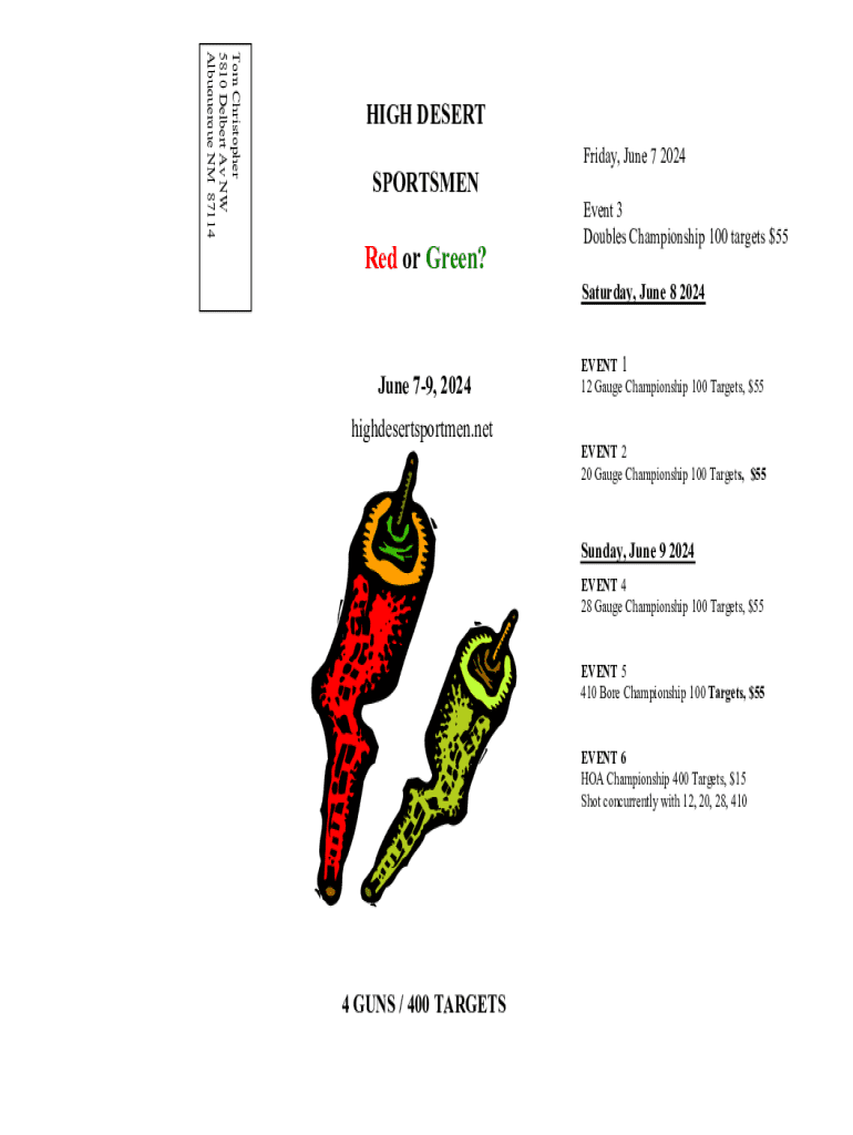 Tom Christopher 5810 Delbert Av NW Albuquerque NM 87114HIGH DESERT SPORTSMENRed or Green?June 79, 2024 highdesertsportmen.netFriday, June 7 2024 Event 3 Doubles Championship 100 targets $55 Saturday,