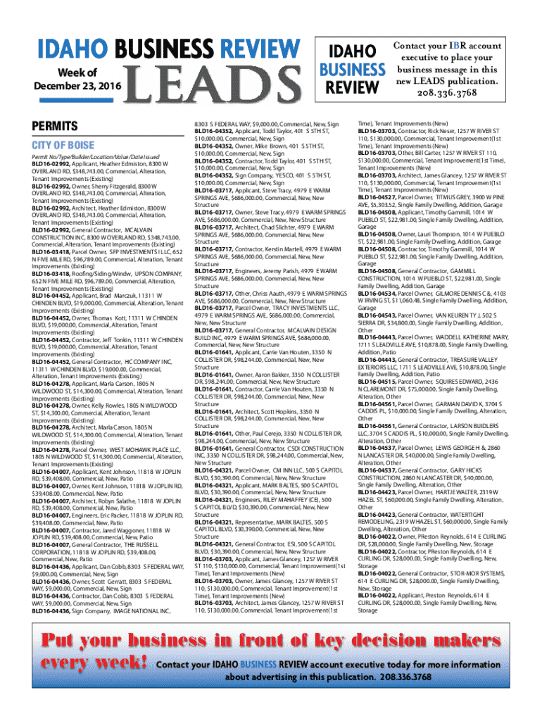 ID IDAHO AHO BUSINES BUSINESSS REVIEW Week ofLEADSDecember 23, 2016PERMITS PERMITSCITY OF BOISE Permit No/Type/Builder/Location/Value/Date Issued CITY OF BOISEBLD1500780, Roofing/Siding/Windw, HOBSON FABRICATING Permit No/Type/Builder/Location/Value/Date Issued CORP, 6767 W FAIRVIEW AVE, $19,825.00, Commercial, Alteration, BLD1602992, Applicant, Heather Edmiston, 8300 W Roof OVERLAND RD, $348,743.00, Commercial, Alteration, BLD1500745, Sign Company, LYTLE SIGNS INC, 6982 W STATE ST, Tenant...