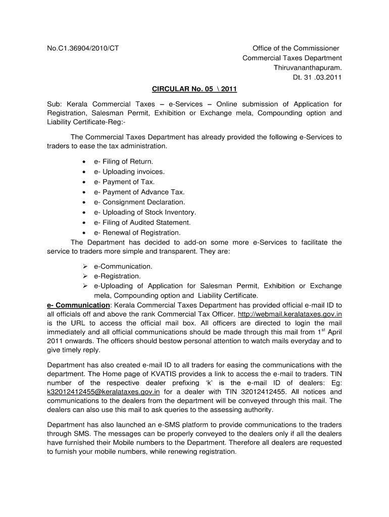 No. C1.36904/2010/CT Office of the Commissioner Commercial Taxes Department Thiruvananthapuram. DT. 31 .03.2011 CIRCULAR No. 05 2011 Sub: Kerala Commercial Taxes e-Services Online submission of Application