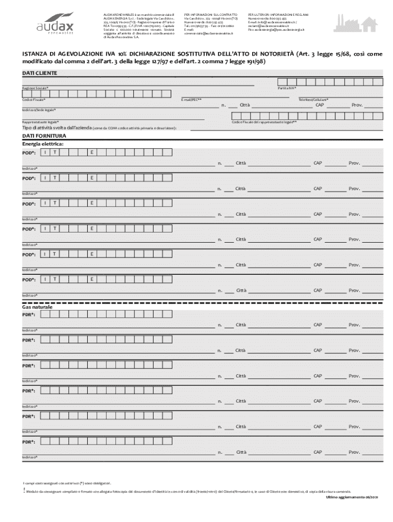 Compilare il modulo di richiesta fornendo tutti i dati richiesti, inclusa la denominazione esatta della società (Audax Energia Srl) e il numero di partita IVA.