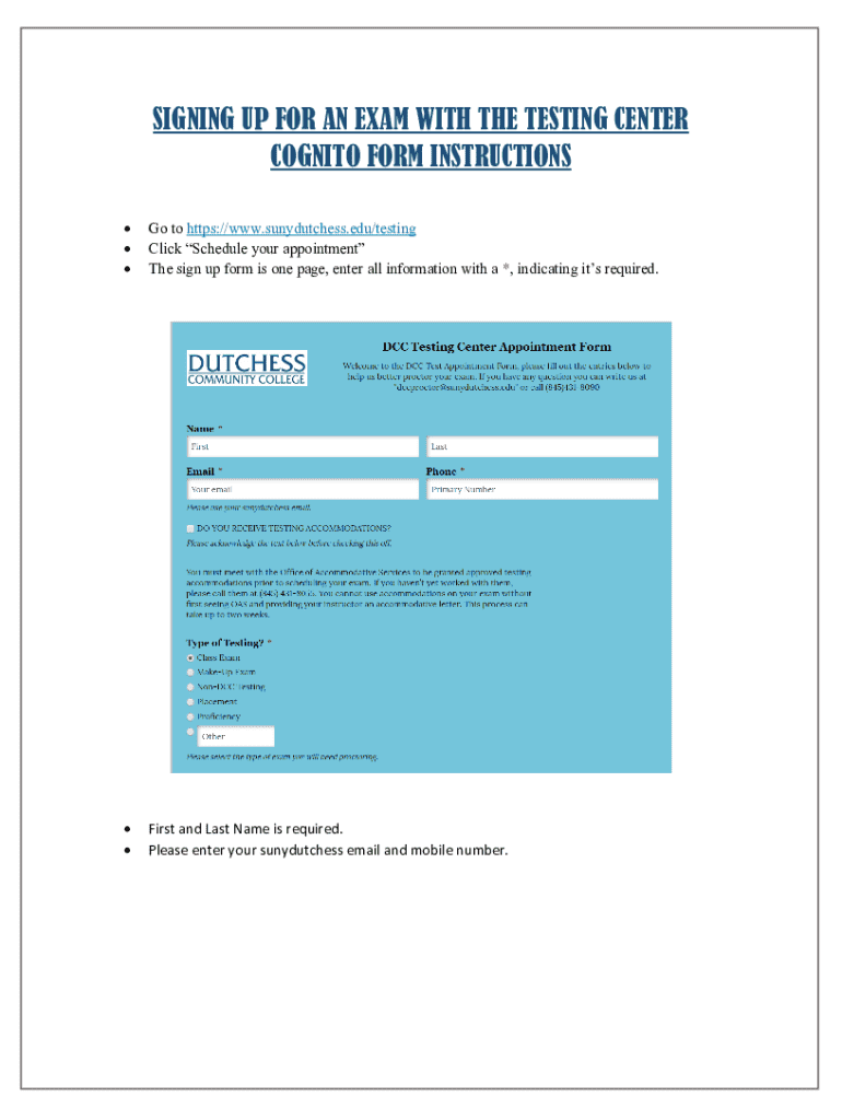 Follow these instructions for signing up for an exam at SUNY Dutchess Testing Center, including scheduling, accommodations, and important details.