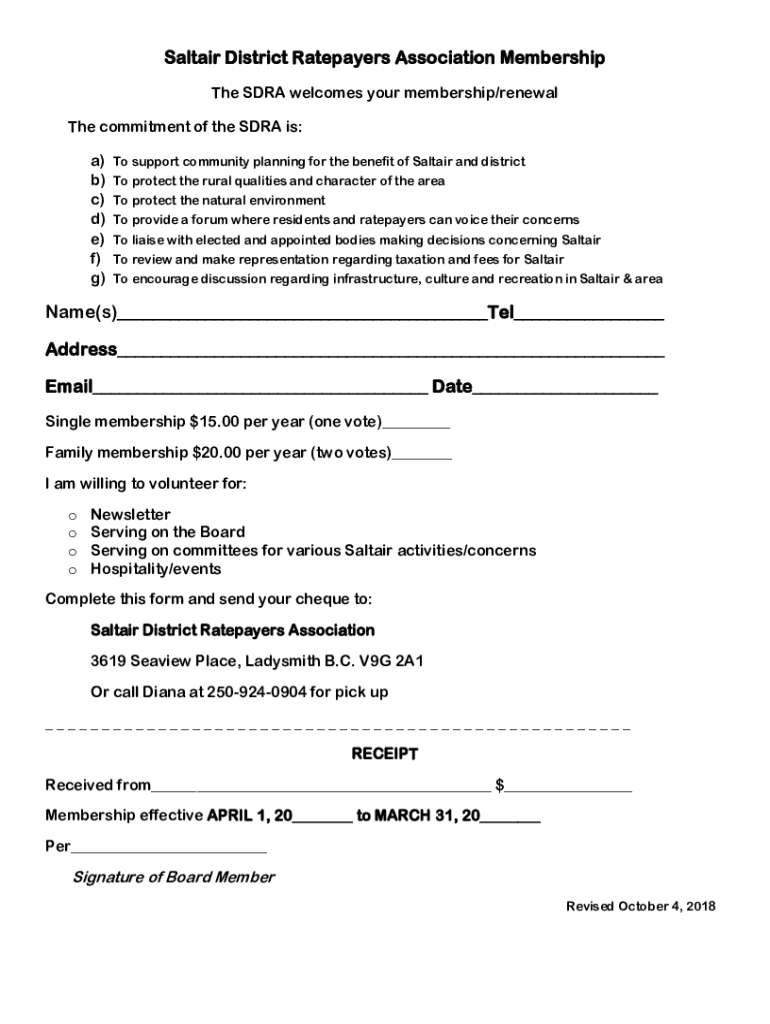 Obtain a copy of the Saltair District Ratepayers Association membership application form.