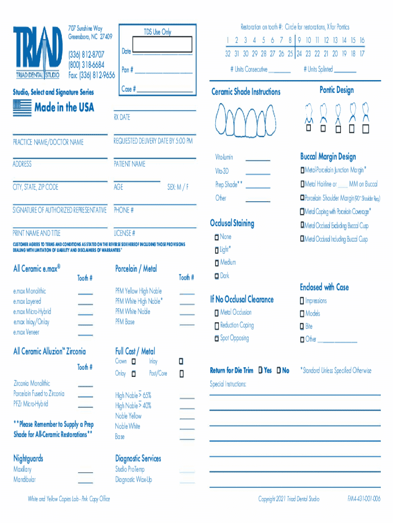 Fax: (336) 8129656Studio, Select and Signature Serenade in the USA Restoration on tooth #: Circle for restorations, X for
