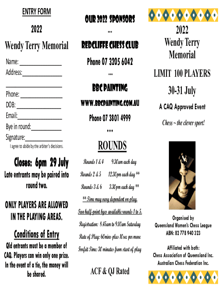 Register for the 2022 Wendy Terry Memorial Chess Tournament in Queensland. Join for a chance to win cash prizes and enjoy a thrilling chess experience!